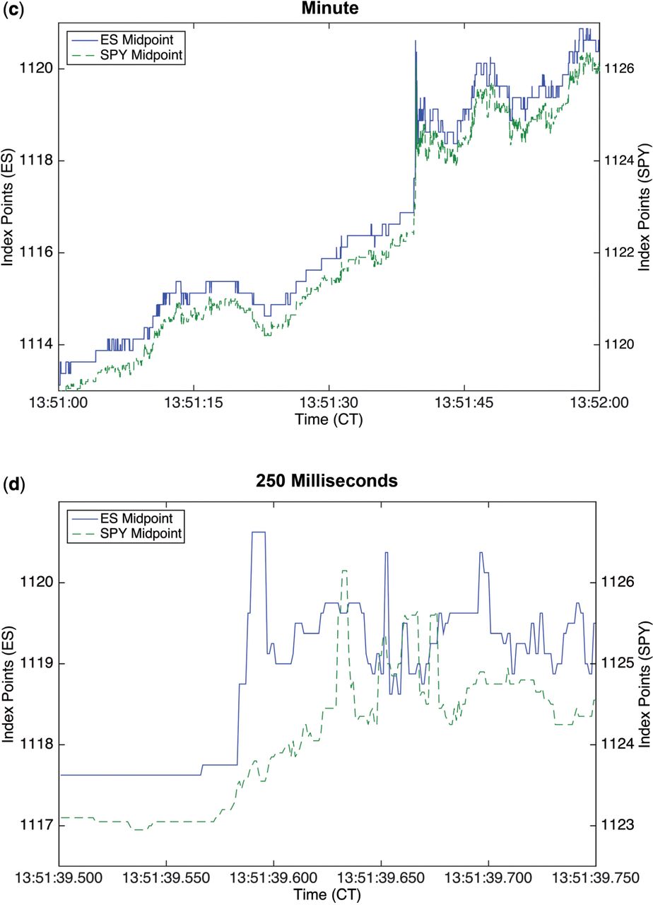 This phenomenon is shown in the figure below, which depicts the price paths of the two largest financial instruments that track the S&P 500 index, the SPDR S&P 500 exchange traded fund (ticker: SPY) and the S&P 500 E-mini futures contract (ticker: ES), on a sample trading day in 20111.