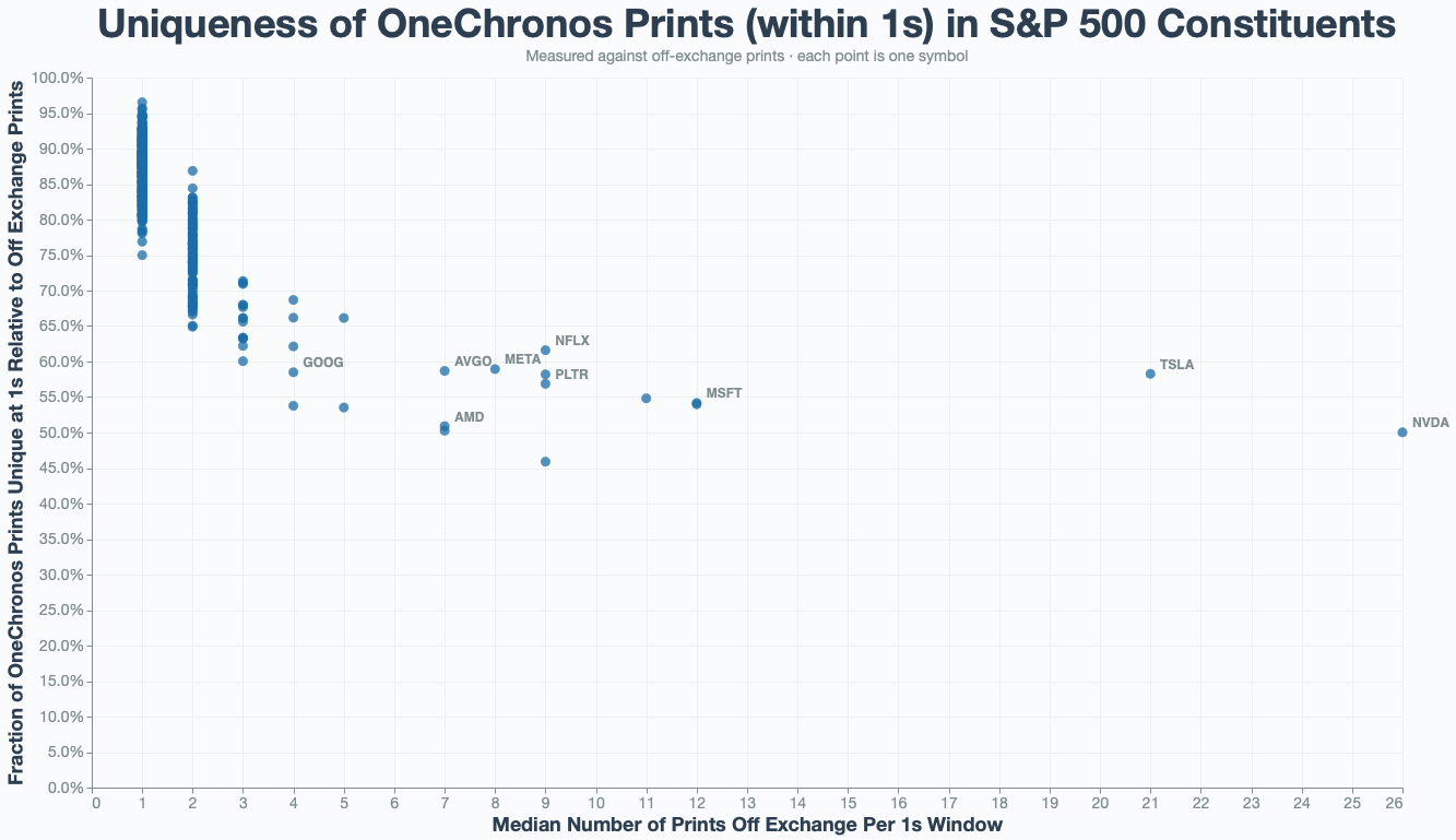 % of OneChronos trades where no off exchange trade is observed within (pre or post) +1-second of trade time, plotted against the median number of off-exchange trades over all +1-second windows with any trade. Measured per security for all securities in the S&P 500 as of December 2025. Date range: 01/12/2026 to 01/28/2026. Sources: OneChronos, SIP (UTP/CTA). ↩︎