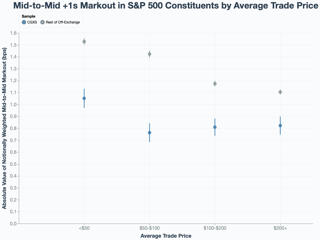 Markouts are the notionally weighted absolute value in midpoint quote differential at each lag (seconds, here +- 5 seconds around trade time) relative to prevailing midpoint quote at time of trade. Markouts aggregated over multiple securities are notionally weighted by security notional value transacted - the notional weighting per security is determined by the ‘Rest of Off Exchange’ sample and used for both ‘CGXS’ and ‘Rest of Off Exchange’ series. Standard errors represent the notionally-weighted standard deviation of individual trade markouts divided by the square root of trade count at the security-date-lag level, then aggregated across securities and dates, notionally weighted. Outliers of >= 200 bps of markout are excluded from the sample. ↩︎